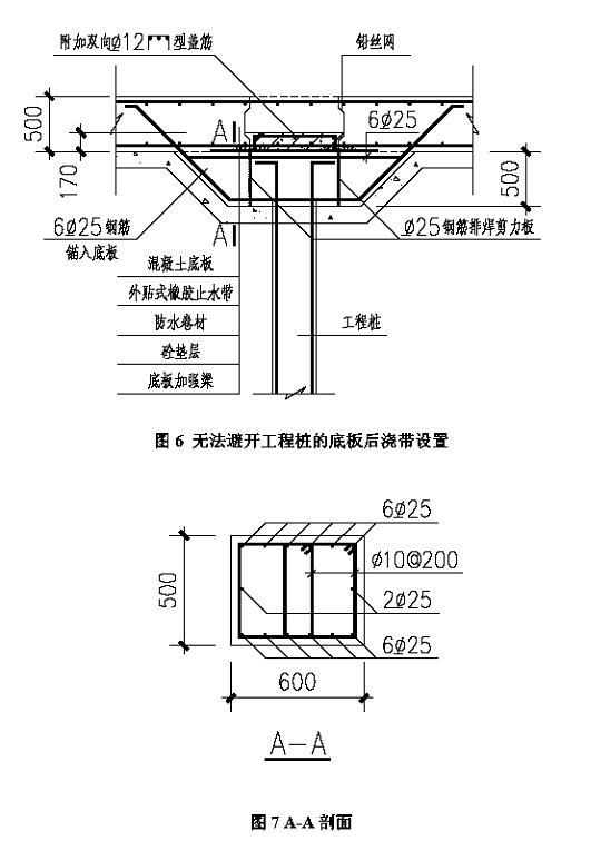 為保證橡膠止水帶的連續(xù)性,將無(wú)法避開(kāi)的工程樁進(jìn)行下沉式處理,下沉高度為500mm。同時(shí)設(shè)置一道底板加強(qiáng)梁,以保證無(wú)法避開(kāi)的工程樁與結(jié)構(gòu)底板的連接。在加強(qiáng)梁中后澆帶位置處設(shè)置兩排φ25 鋼筋排焊剪力板,使加強(qiáng)梁后澆帶位置的混凝土能與底板后澆帶共同作用。如圖6、圖7 所示。