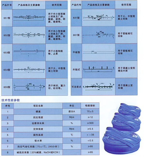 PVC、EVA塑料止水帶是由聚氯乙烯樹脂與各種填加劑,經(jīng)混合、造粒、擠出等工序而制成的止水材料。PVC、EVA塑料止水帶該產(chǎn)品利用彈性體材料具有的彈性變形特性在建筑構(gòu)造接縫中起到防漏、防滲作用,且具有耐腐蝕、耐久性好的特點(diǎn)。PVC、EVA塑料止水帶主要用于混凝土澆注時(shí)設(shè)置在施工縫及變形縫內(nèi)與混凝土構(gòu)成為一體的基礎(chǔ)工程。如隧道、涵洞、引水渡槽、攔水壩、貯液構(gòu)筑物、地下設(shè)施等。