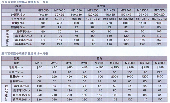 目前塑料芯體有矩形、中空矩陣、圓形中空圓形等多種結構形式。該材料克服了傳統盲溝的缺點,具有表面開孔率高,集水性好,空隙率大,排水性好,抗壓性強, 耐壓性好,柔性好,適應土體變形,耐久性好,重量輕,施工方便,工人勞動強度大大下降,施工效率高,因而受到施工單位的普遍歡迎,并得到廣泛的應用。